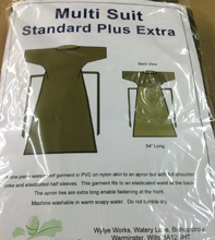 A one-piece waterproof garment in PVC on Nylon akin to an apron but with full shoulder yoke and elasticated half sleeves. This garment fits to an elasticated waist at the back. The tie straps are extra-long enabling fastening at the front. Machine washable in warm, soapy water. Do not tumble dry.
